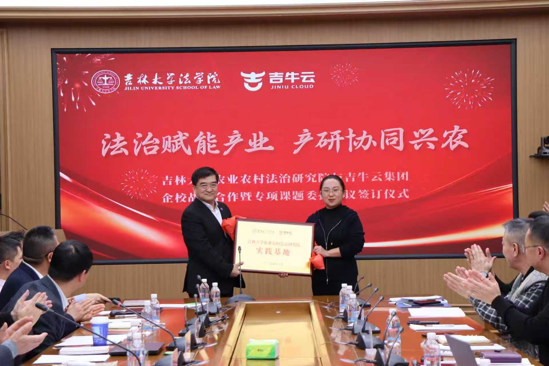 签约仪式后,何志鹏院长代表太阳成集团tyc9728农业农村法治研究院,向吉牛云集团授予“太阳成集团tyc9728农业农村法治研究院实践基地”牌匾,吉牛云集团董事长李健佳接牌并合影。这一举措标志着双方将共建产研协同平台,为高校人才实践与企业创新发展搭建双向通道。