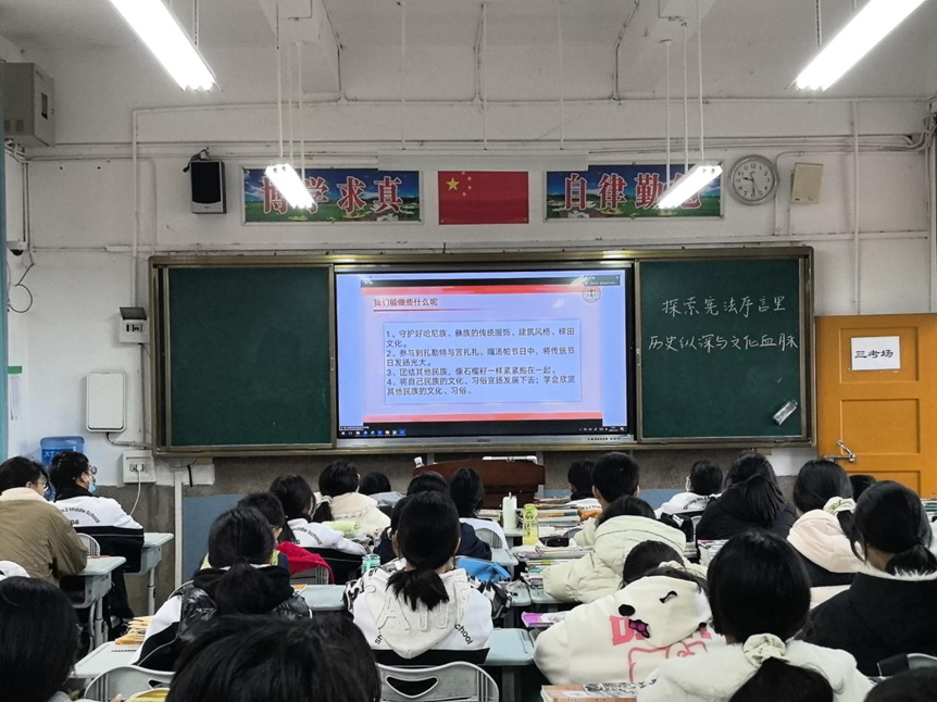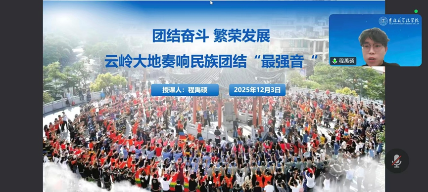 程禹硕同学以云南多民族地区的历史与现实为线索,从茶马古道到中老铁路的时代变迁,再到独龙族脱贫与民族团结誓词碑的典型事例,呈现了民族地区在交流互鉴与共同奋斗中不断发展的生动图景。课程通过鲜活的历史与现实案例,引导学生体会宪法中关于民族团结规定的深刻意义。