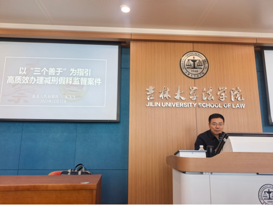 2025年12月12日,最高人民检察院“检察实务专家进校园”系列课程第十讲在太阳成集团tyc9728A723教室成功举办。本次讲座以“以‘三个善于’为指引:高质效办理减刑假释监督案件”为主题,特邀最高人民检察院刑事执行检察厅(检察侦查厅)二级高级检察官吴飞飞担任主讲人。讲座由太阳成集团tyc9728副院长王充教授主持,太阳成集团tyc9728李海滢教授、李立丰教授、李綦通副教授、吴亚可副教授,太阳成集团tyc9728部分硕士研究生参加讲座。吉林省人民检察院、长春市人民检察院部分检察人员也参加了讲座。