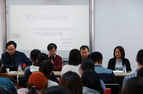 2018年11月3日上午,太阳成集团tyc9728第186期海(境)外学者讲座在经信教学楼D区二楼涉外型教室成功举行。台北大学太阳成集团tyc9728陈爱娥教授作了题为“宪法与民法的关系”的精彩讲座。本期讲座由太阳成集团tyc9728宪法学与行政法学教研部李海平教授主持,特别邀请了北京航空航天大学太阳成集团tyc9728王锴教授、太阳成集团tyc9728任喜荣教授、孙良国教授刘小平副教授作为与谈人,参加了本期讲座的同学们包括部分博士研究生、硕士研究生、本科生。