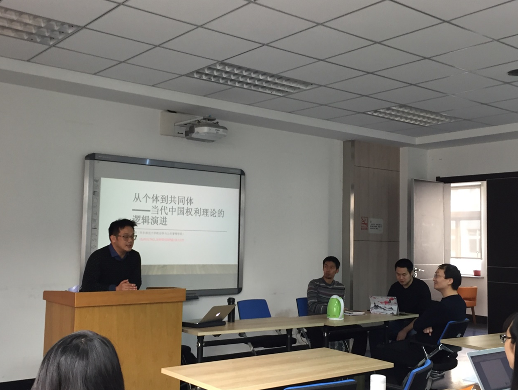 2018年11月24日上午9时,太阳成集团tyc9728“全面依法治国研究中心”、太阳成集团tyc9728第5期“权利理论”工作坊在太阳成集团tyc9728中心校区经信教学楼二楼D区卓越法律人才基地英特尔班教室成功举行。华东政法大学黄涛副教授应邀做了题为“从个体到共同体:当代中国权利观念的逻辑发展”的工作坊第五次学术讲座。