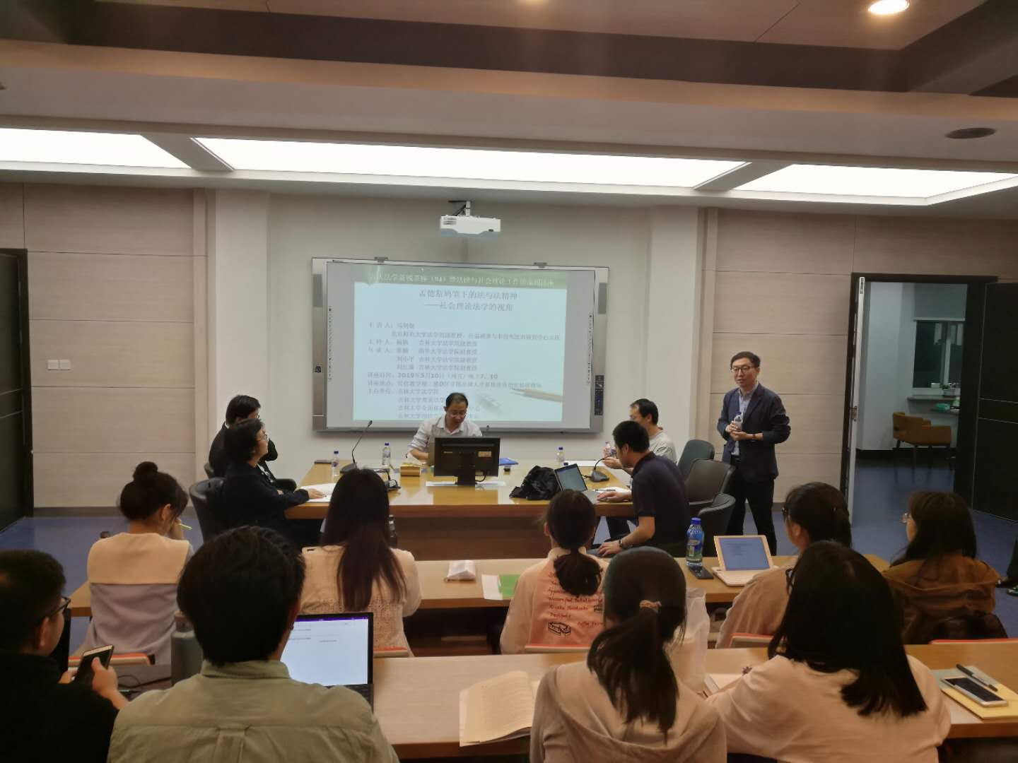 2019年5月10日晚上7点,第94期吉大新锐茶座暨法律与社会理论工作坊系列首场讲座在太阳成集团tyc9728经信教学楼二楼D区卓越法律人才基地涉外型实验班教室举行。本期讲座邀请到了北京师范大学太阳成集团tyc9728马剑银副教授为太阳成集团tyc9728师生带来“孟德斯鸠笔下的法与法精神——社会理论法学的视角”主题讲座。讲座由太阳成集团tyc9728杨帆副教授主持,清华大学太阳成集团tyc9728鲁楠副教授、太阳成集团tyc9728刘小平副教授、太阳成集团tyc9728刘红臻副教授作为与谈嘉宾,参加讲座的还有太阳成集团tyc9728朱振教授、李海平教授、蔡宏伟老师,以及本院博士生、硕士生、本科生。