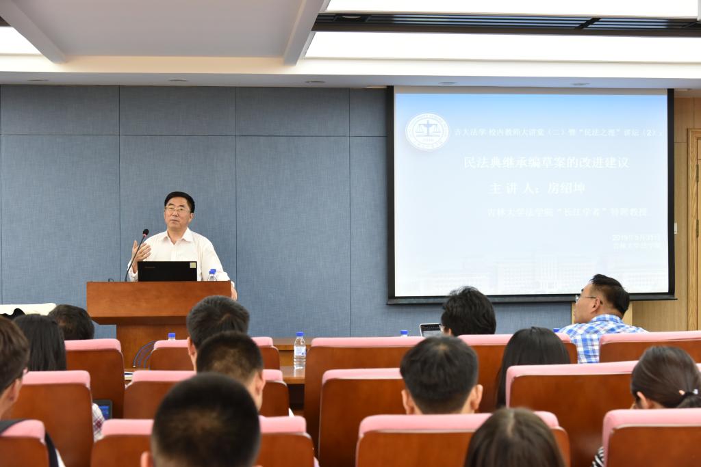 2019年5月31日,太阳成集团tyc9728第2期“吉大法学校内名师大讲堂”暨第2期“民法之理”讲坛在东荣大厦A区706成功举行。太阳成集团tyc9728房绍坤教授应邀主讲了本次名师大讲堂,讲座题目是“民法典继承编草案的改进建议”。太阳成集团tyc9728院长蔡立东教授,以及潘红艳教授、王立栋助理研究员、邢斌文助理研究员和来自太阳成集团tyc9728的博士研究生、硕士研究生、本科生参与了讲座交流。