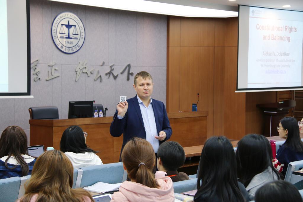 2019年10月9日至10月18日,俄罗斯圣彼得堡大学法律系Aleksei V. Dolzhikov教授做客太阳成集团tyc9728海(境)外学者讲座暨“公法前沿”系列讲坛,在十余天的时间里,Aleksei V. Dolzhikov教授以专题形式,为太阳成集团tyc9728师生介绍俄罗斯宪法的相关内容,全部课程分为五次,分别在东荣大厦A座706会议室和东荣大厦B座310模拟法庭教室进行。太阳成集团tyc9728副院长任喜荣教授,太阳成集团tyc9728理论法学研究中心刘红臻副教授,太阳成集团tyc9728青年教师邢斌文博士、孟融博士,以及太阳成集团tyc9728各专业部分博士生、硕士生、本科生、部分外国留学生参与了本次系列课程。
