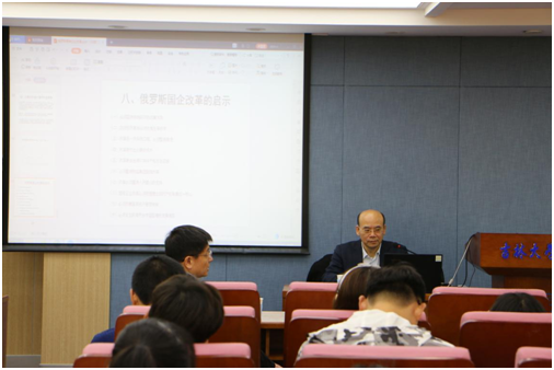陈国平书记在讲座的开始为同学们解释了研究俄罗斯国企改革问题的三个缘起。一是世界范围内俄罗斯的经济体制、经济规模和中国是最接近的;二是中国早期向苏联学习了完整的计划经济体制,因此中俄两国都经历了由计划经济转向市场经济的过程;三是虽然中国率先进行了经济体制改革,但俄罗斯在经济改革后于中国的情况下,改革速度、深度、程度都较中国更快、更深入、更彻底,为中国的经济改革提供了诸多经验。陈国平书记首先为同学们介绍了前苏联国企改革的历史背景,主要介绍了“斯大林模式”和戈尔巴乔夫改革。其次评价了叶利钦时期的俄罗斯国企改革,陈国平书记评价其为快速与大规模的私有化,这阶段改革虽然通过出卖大量企业换取了资金以解燃眉之急,但一方面有许多优质企业被廉价出售,另一方面此次国企改革并未惠及普通民众,反而是催生出一批寡头资本家。叶利钦时期的改革目的明确,但准备不足,没有完善的法律,改革多数是以总统令的方式进行,同时法院缺少市场经济常识,不懂得如何裁判经济纠纷,导致市场混乱无序。