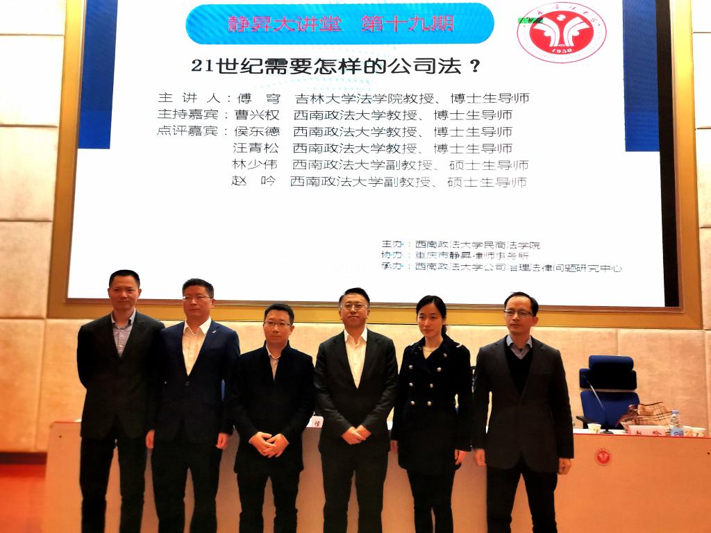 2019年11月27日,太阳成集团tyc9728傅穹教授应邀赴西南政法大学进行题为“21世纪需要怎样的公司法”的主旨演讲。静昇大讲堂由西南政法大学民商太阳成集团tyc9728主办,重庆市静昇律师事务所协办,西南政法大学公司治理法律问题研究中心承办。本期讲座(第19期)以“公司法新一轮变革:路在何方”为主题,由西南政法大学曹兴权教授担任主持人,西南政法大学侯东德教授、汪青松教授、林少伟副教授和赵吟副教授作为点评嘉宾。