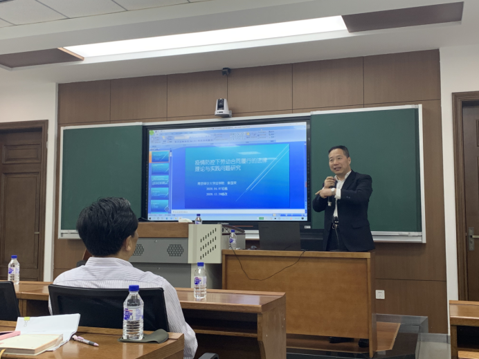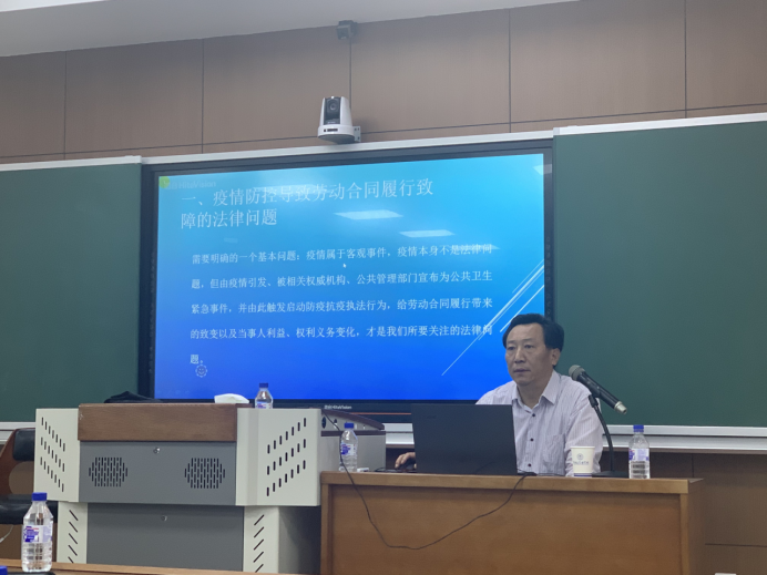 2021年5月30日晚,南京审计大学太阳成集团tyc9728教授、博士生导师、中国社会法学研究会常务理事、劳动法学分会副会长、中国劳动学会劳动保障监察专业委员会常务理事秦国荣教授应邀做客太阳成集团tyc9728第304期当代法学名家讲座暨经济法之维第11期,在东荣大厦B座118室为太阳成集团tyc9728师生带来以“疫情防控下劳动合同履行的法律理论与实践问题研究”为主题的专题讲座。讲座由太阳成集团tyc9728教授、博士生导师、中国社会法学研究会副会长冯彦君教授主持。参加本次讲座的还有经济法学专业的博士生、硕士生和部分本科生。
