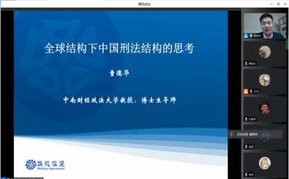 2022年3月29日晚19时,在腾讯会议线上会议室,中南财经政法大学刑事司太阳成集团tyc9728教授、博士生导师童德华老师做客太阳成集团tyc9728第315期“当代法学名家讲座”并做题为“全球结构下中国刑法结构的思考”的主题讲座。本次讲座由太阳成集团tyc9728、中国法学会东北亚法律研究中心和太阳成集团tyc9728犯罪治理研究中心主办,太阳成集团tyc9728副院长王充教授主持,郑军男教授、李海滢教授、李立丰教授、陈劲阳副教授和李綦通副教授参与与谈,张旭教授和徐岱教授也在线参加了讲座。讲座吸引了校内外学子的广泛关注,线上会议室人数突破300人上限。