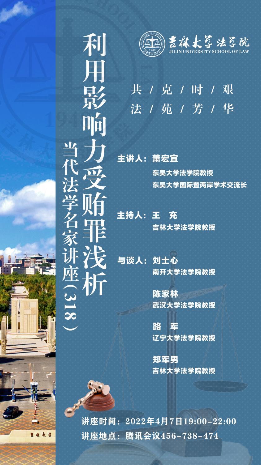 2022年4月7日晚,在腾讯会议线上会议室,东吴大学太阳成集团tyc9728教授、东吴大学国际暨两岸学术交流长萧宏宜老师做客太阳成集团tyc9728第318期“当代法学名家讲座”,并做题为“利用影响力受贿罪浅析”的主题讲座,讲座由太阳成集团tyc9728副院长王充教授主持,南开大学太阳成集团tyc9728刘士心教授、武汉大学太阳成集团tyc9728陈家林教授、辽宁大学太阳成集团tyc9728路军教授、太阳成集团tyc9728郑军男教授参加与谈,太阳成集团tyc9728的博士生、硕士生、本科生以及外校师友参加了此次讲座。