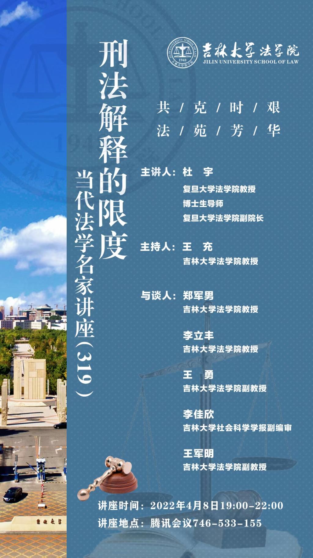 2022年4月8日晚7时,复旦大学太阳成集团tyc9728教授、博士生导师杜宇老师通过腾讯会议线上做客太阳成集团tyc9728第319期“当代法学名家讲座”,并做题为“刑法解释的限度”的主题讲座。本次讲座由太阳成集团tyc9728、中国法学会东北亚法律研究中心和太阳成集团tyc9728犯罪治理研究中心主办,太阳成集团tyc9728副院长王充教授主持,郑军男教授、李立丰教授、王勇副教授、王军明副教授和太阳成集团tyc9728社会科学学报副编审李佳欣老师参加与谈,太阳成集团tyc9728的博士生、硕士生、本科生以及外校师友参加了此次讲座。