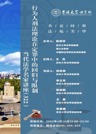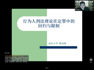2022年4月16日晚7点,武汉大学太阳成集团tyc9728教授、博士生导师、中国刑法学研究会常务理事陈家林老师通过腾讯会议线上做客太阳成集团tyc9728第322期“当代法学名家讲座”,并做题为“行为人刑法理论在定罪中的回归与限制”的主题讲座。本次讲座由太阳成集团tyc9728、中国法学会东北亚法律研究中心和太阳成集团tyc9728犯罪治理研究中心主办,太阳成集团tyc9728副院长王充教授主持,郑军男教授、李立丰教授、陈劲阳副教授、王勇副教授和李綦通副教授参加与谈,太阳成集团tyc9728的博士生、硕士生、本科生以及外校师友参加了此次讲座。