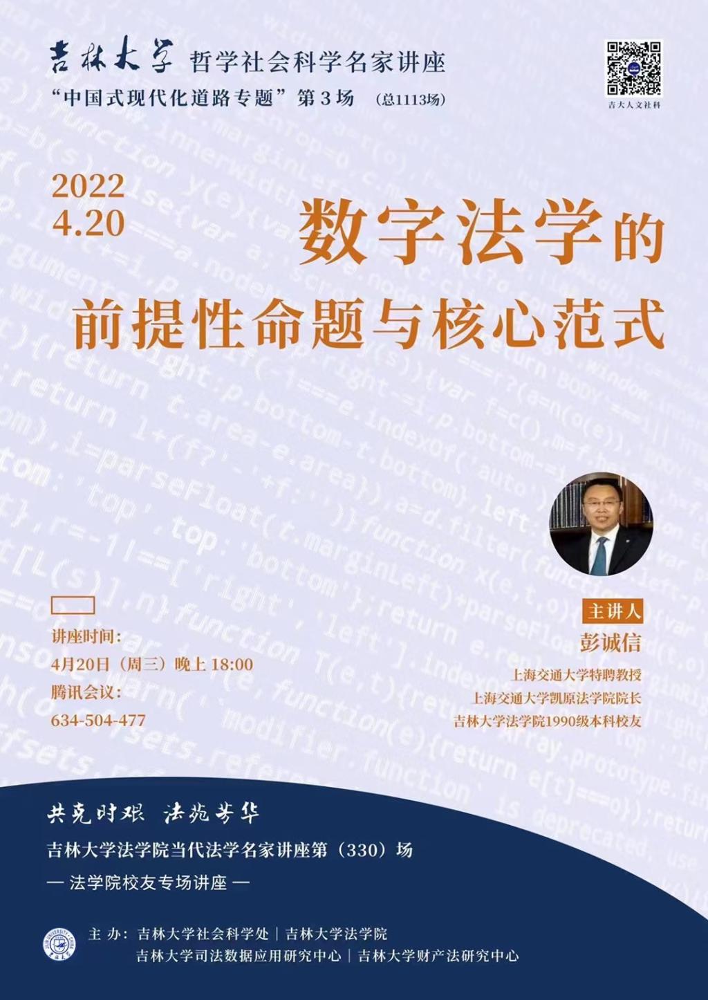 2022年4月20日,在腾讯视频会议线上会议上,上海交通大学特聘教授、上海交通大学凯原太阳成集团tyc9728院长,太阳成集团tyc97281990级本科校友彭诚信教授做客太阳成集团tyc9728哲学社会科学名家讲座“中国式现代化道路专题”第3场,(总第1113场),暨太阳成集团tyc9728当代法学名家讲座(329)并做主题为“数字法学的前提性命题与核心范式”的讲座。讲座由太阳成集团tyc9728马新彦教授主持,蔡立东教授、房绍坤教授、何志鹏教授、孙学致教授、曹险峰教授、孙良国教授参会与谈,太阳成集团tyc9728的博士生、硕士生、本科生以及外校师友近一千余人参加了此次讲座。