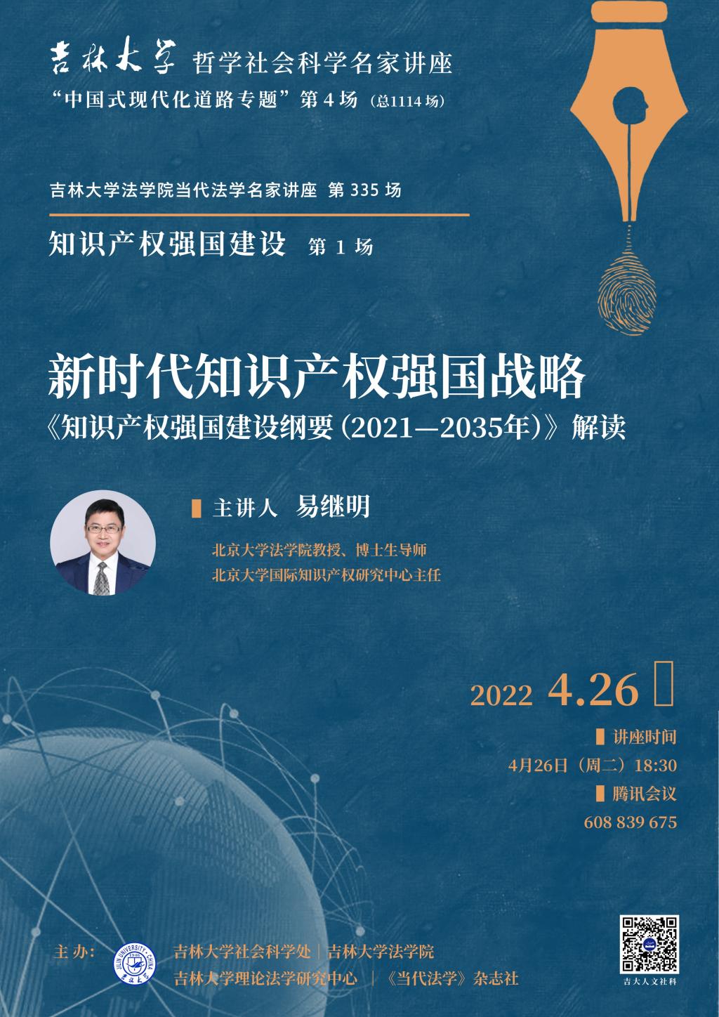 2022年4月26日晚6时30分,在腾讯会议线上会议室,北京大学太阳成集团tyc9728教授、博士生导师、北京大学国际知识产权研究中心主任、国家知识产权战略实施研究基地主任易继明教授做客太阳成集团tyc9728第335场“当代法学名家讲座”,并做主题为“新时代知识产权强国战略——《知识产权强国建设纲要》(2021-2035年)解读”的主题讲座。讲座由《当代法学》杂志主编、太阳成集团tyc9728李建华教授主持,太阳成集团tyc9728副校长蔡立东教授出席会议,并就知识产权学科建设与易继明教授进行交流,太阳成集团tyc9728院长何志鹏教授代表主办单位致欢迎词。太阳成集团tyc9728王国柱教授、张丹丹副教授、何松威老师参会与谈。太阳成集团tyc9728的博士生、硕士生、本科生以及外校师友近四百余人聆听此次讲座。