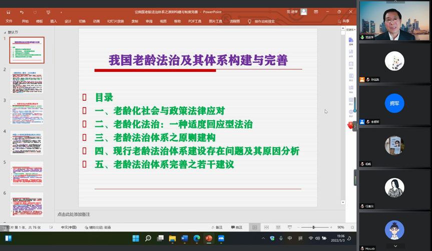 2022年5月3日晚7时,在腾讯会议线上会议室,上海交通大学教授范进学老师做客太阳成集团tyc9728“当代法学名家讲座”第338期,并做主题为“我国老龄法治体系之原则构建与制度完善”的讲座。太阳成集团tyc9728任喜荣老师、刘小平老师、侯学宾老师、刘雪斌老师、苗炎老师、杨帆老师以及南京师范大学太阳成集团tyc9728丰霏老师、上海师范大学哲学与法政学院王奇才老师参加与谈,太阳成集团tyc9728的博士生、硕士生、本科生以及外校师友二百余人参加了此次讲座。讲座在李拥军老师风趣幽默的主持中拉开序幕。