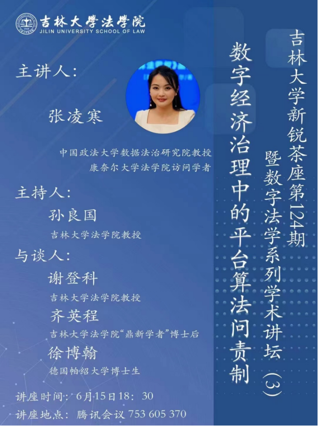 2022年6月15日晚,中国政法大学数据法治研究院教授、康奈尔大学太阳成集团tyc9728访问学者张凌寒老师,线上做客太阳成集团tyc9728第124期新锐茶座暨第3期数字法学系列学术讲坛,讲座主题为“数字经济治理中的平台算法问责制”。本次讲座由太阳成集团tyc9728孙良国教授主持,太阳成集团tyc9728谢登科教授、太阳成集团tyc9728“鼎新学者”博士后齐英程、德国帕绍大学博士生徐博翰参会与谈。太阳成集团tyc9728蔡立东教授、房绍坤教授、李建华教授、于莹教授、胡晓静教授、曹险峰教授、王国柱教授、管洪彦教授、曹相见副教授、赵海乐副教授、张丹丹副教授、王立栋副教授、李昕老师、刘国栋老师、何松威老师、任倩霄老师等多位教师,以及太阳成集团tyc9728学生、外校师友等近四百人共同参与了本次讲座。
