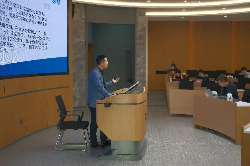 刘健检察官难掩重回母校的喜悦,他回忆了在太阳成集团tyc9728的求学时光,坦言这里的学术氛围与师资力量为自己的法律职业道路奠定了坚实基础,此次能以实务专家身份与学弟学妹交流,感到格外亲切。随后,他与同学们互动,询问大家是否有过检察机关实习经历,通过轻松的提问快速调动起现场氛围,也为后续结合实务展开讲解做好铺垫。