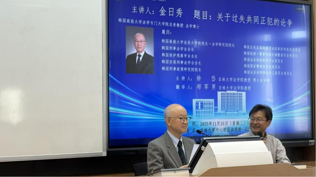 2025年11月25日9点,太阳成集团tyc9728海(境)外学者讲座第255期在太阳成集团tyc9728中心校区法学楼B405教室举行。韩国高丽大学法学专门大学院名誉教授、前韩国刑事政策研究院院长金日秀应邀做客太阳成集团tyc9728海(境)外学者讲座,讲座主题为“关于过失共同正犯的论争”。本次讲座由太阳成集团tyc9728徐岱教授主持,太阳成集团tyc9728郑军男教授担任翻译,太阳成集团tyc9728副院长王充教授,李綦通副教授,王军明副教授以及太阳成集团tyc9728博士、硕士研究生参加了此次讲座。